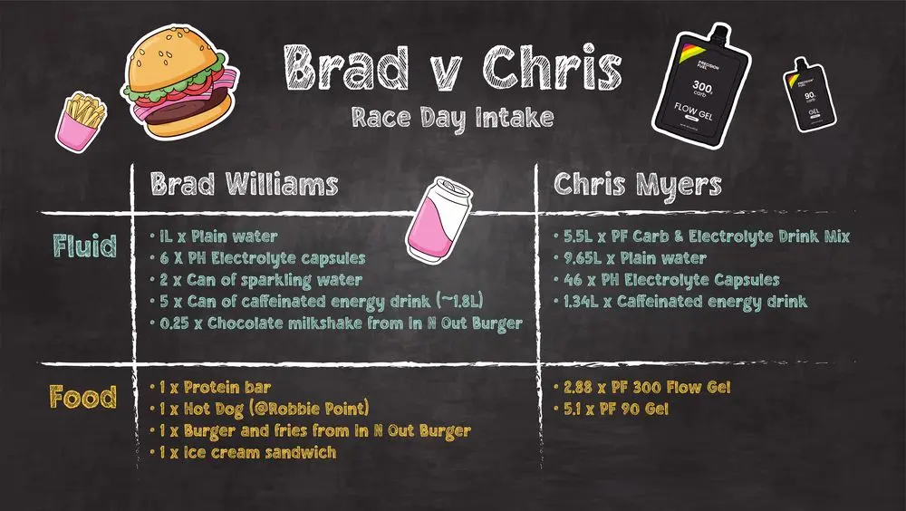 I got to meet with newsletter sponsor Precision Fuel & Hydration CEO Andy Blow and COO Jonny Tye last month, a few days before Jonny was to crew Dan Jones, who was running the UTMB. Afterward, I thought, “I should have asked Jonny if he’s ever kept track of all the food he eats while crewing,” because that (to me) would be really interesting. Fast-forward a few weeks to me reading the “Crewing 101: How to crew an endurance athlete” article on the PFH website, scrolling to the end, and found this chart comparing the nutrition intake of Chris Myers, who took 5th in the Western States Endurance Run, and Brad Williams, who helped crew Chris (it looks like Brad was a little under-nourished, in my opinion):