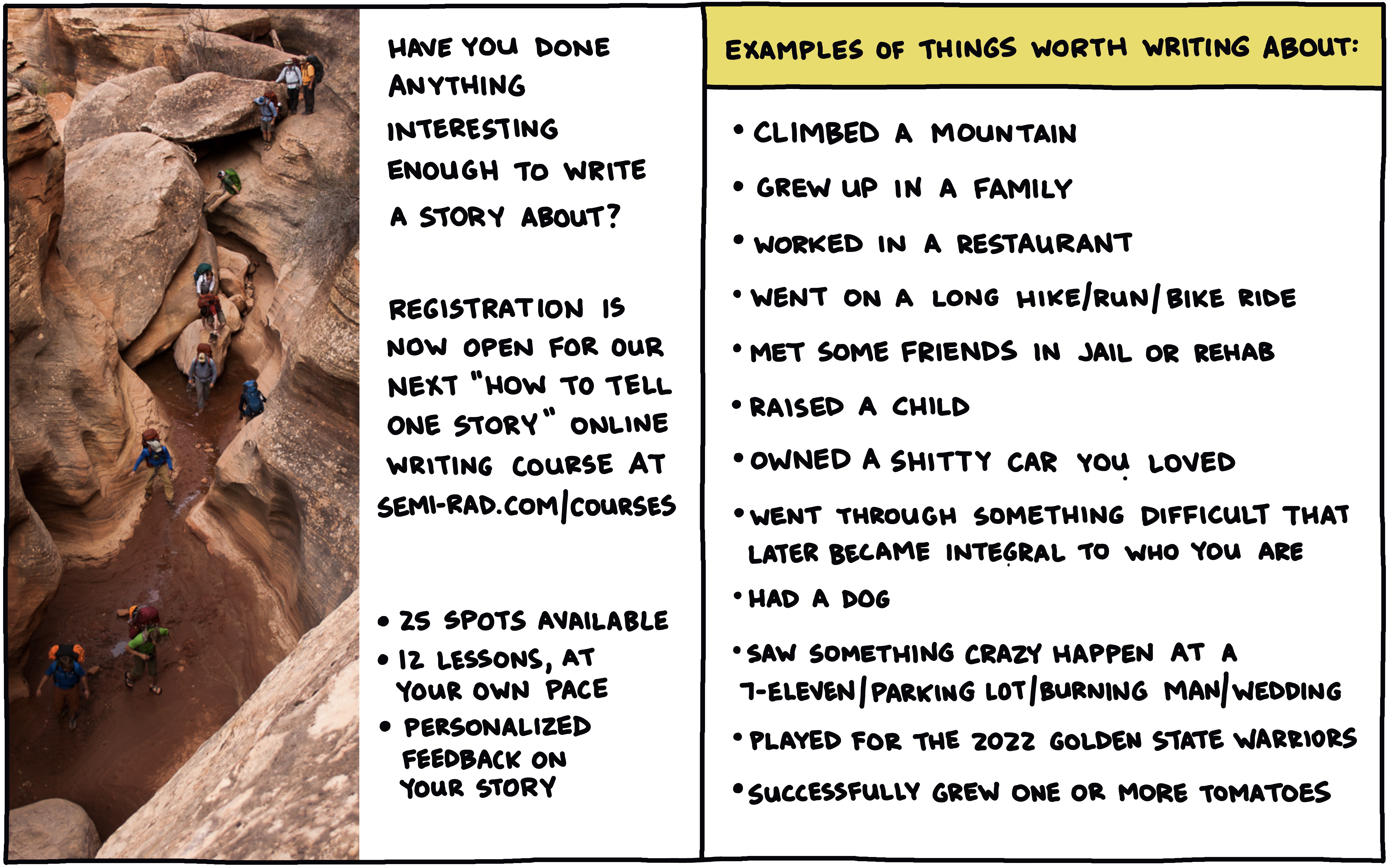 Friday Inspiration 531 IF YOU ARE LOOKING FOR A SIGN that you should say, “oh, what the hell, I’ll sign up for Brendan’s trail running and writing workshop in June,” this is it: We are re-opening our application until April 13 at midnight MST to fill two more spots. I can guarantee we’re going to have fun regardless, so you might as well join us for six days of digging into writing and storytelling, punctuated with mellow trail runs every day before lunch. Here’s the link to check it out. --...