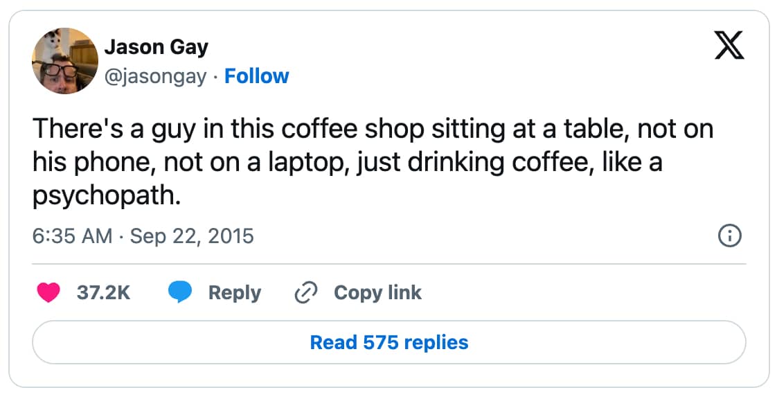 But we all feel rushed, don’t we? We live in a world that seems to get faster and faster every month. And how do we deal with it? Most of us try to adapt and keep up with it all, without even thinking about it. We have eight different methods people can use to contact us and we have to check them every 15 minutes just in case we missed something. We eat lunch at our desks, and drink our coffee out of non-spill vessels, often in our cars. And nobody just sits and drinks coffee anymore, except this legendary Starbucks customer spotted in 2015: