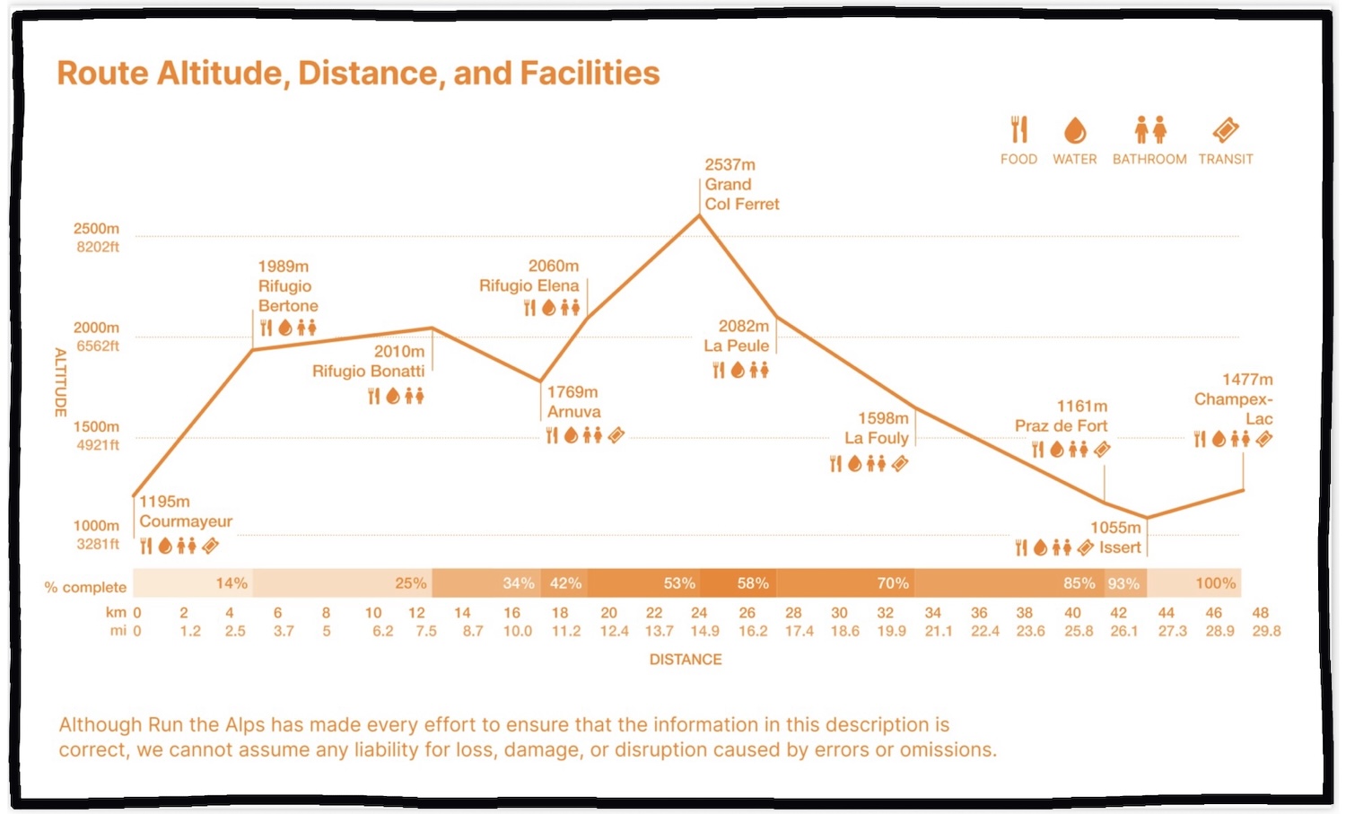 The route started climbing literally a few feet from the front door of our hotel, up the winding streets of Courmayeur, picking up a trail at the edge of town after about a mile of pavement. We passed groups of hikers, Majell jokingly saying to me “surge!” before we sprint-hiked past the groups of 10 and 12 trekkers and my heart rate jumped into Zone 4 territory.