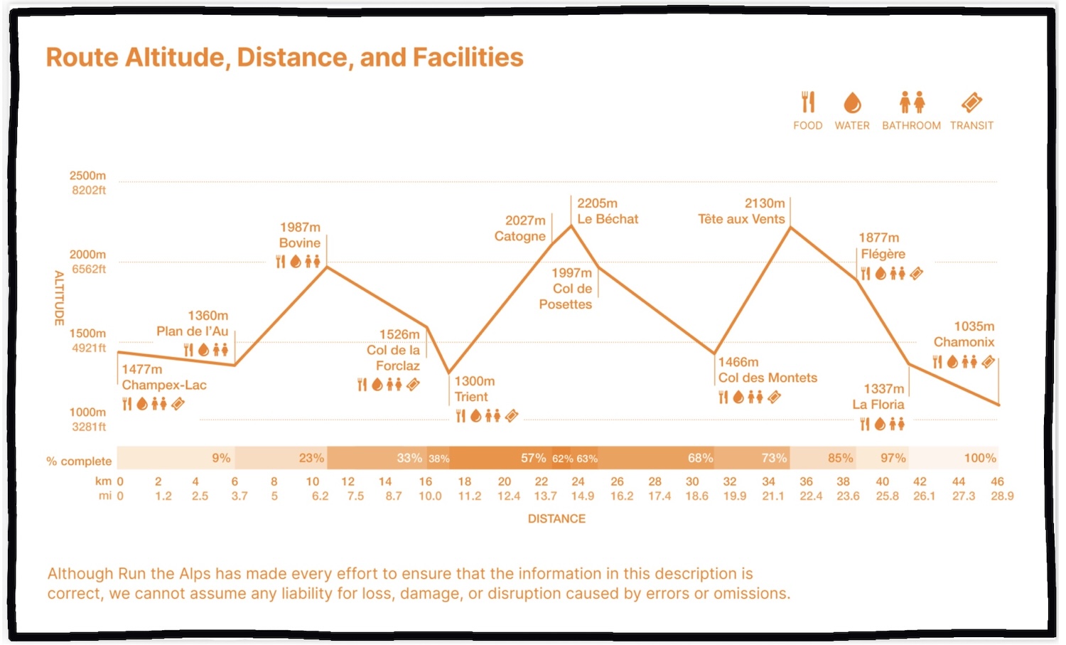 As we passed through the outdoor seating for the cafe at La Floria with about two miles/3 km to go, I started to let myself believe I was going to actually make it—none of my minor aches or pains would turn into something catastrophic, the cold I’d been fighting wouldn’t knock me out, and maybe I’d finish the final bit to the Église Saint-Michel in Chamonix without stumbling and falling.