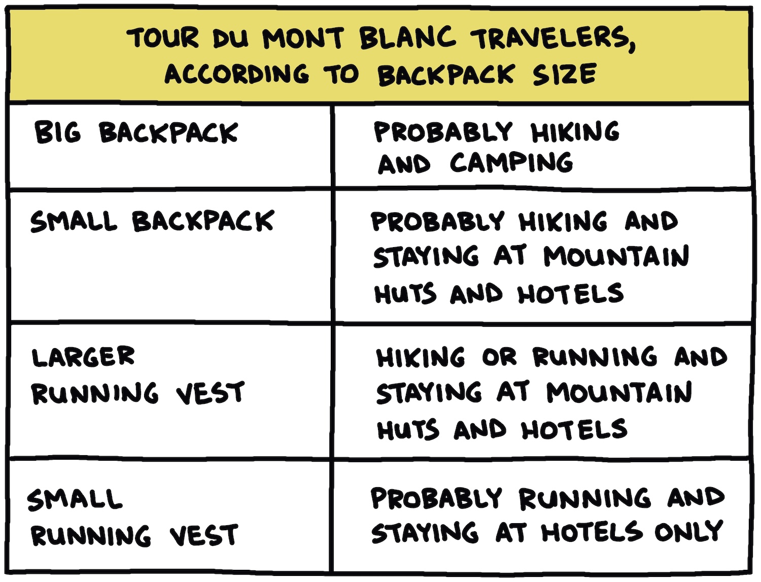 Usually, in the first few miles of our day, we’d pass a few hundred hikers, all making their way on the same route we were, in the same direction. Each year, Mont Blanc draws 20,000 climbers hoping to summit, and each year, the same number of people—20,000—do the Tour du Mont Blanc, walking or running around the mountain. You can generally discern the itinerary of a TMB traveler by the size of their backpack: