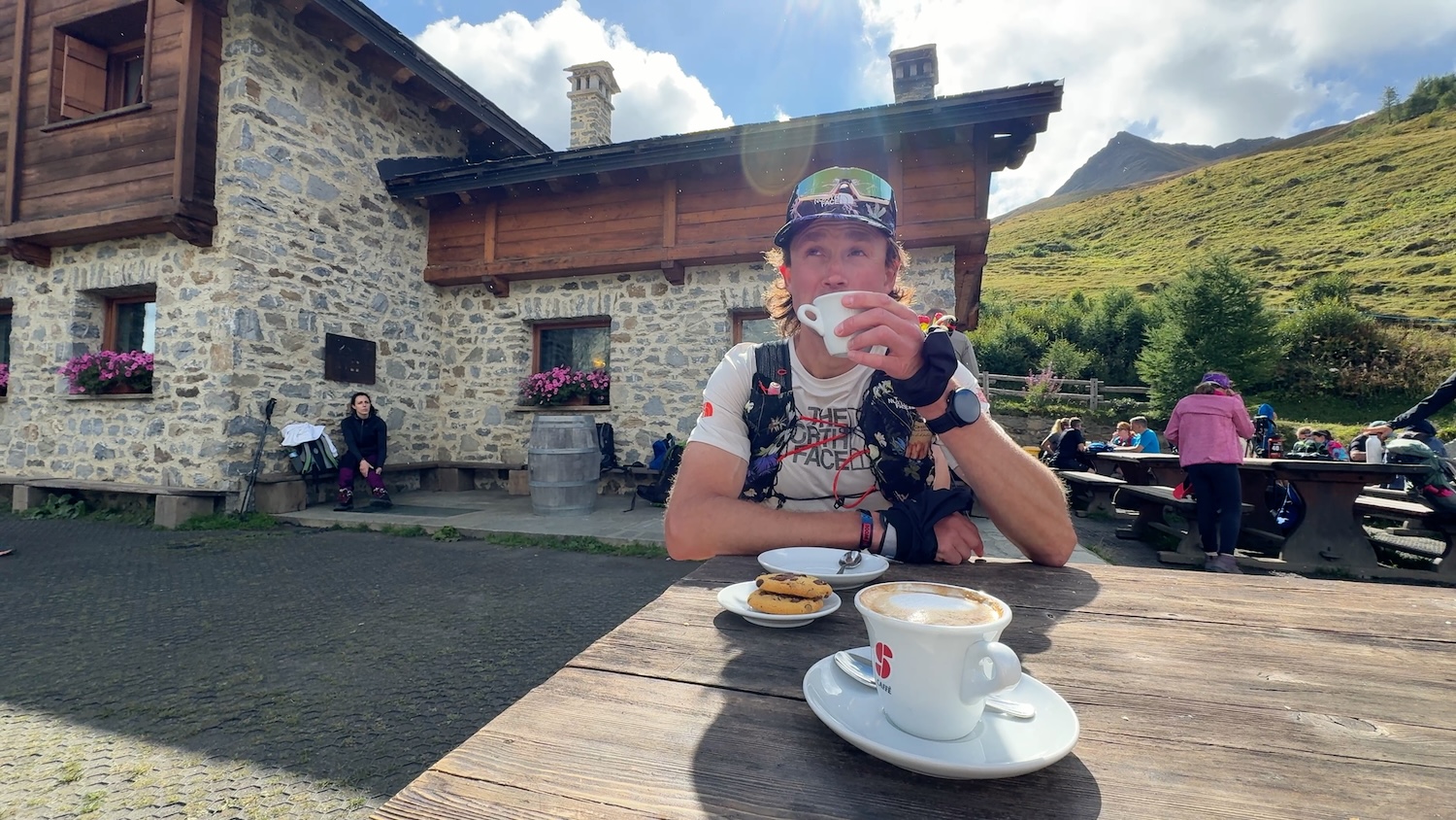 We passed by Rifugio Bertone after climbing 2,500 feet (760 m) in just over 2.5 miles (4 km), then ran as the trail mercifully flattened and contoured around the mountain. We cruised into Rifugio Bonatti, which Majell had said was more hotel than rustic mountain hut, and I ordered a couple cappuccinos and cookies. Majell had also, for some reason, purchased a one-inch-thick chocolate bar and would not let me not help him eat it, so, faced with another challenge in the mountains, I sat there in the sun and enjoyed all of it. There are many differences between the mountains in my beloved American West and the Alps, and every time I get to visit the Alps, I take advantage of places like the Bonatti refuge, which combines a couple of my favorite things: a mountain view and a solid espresso cafe. And also baked goods.